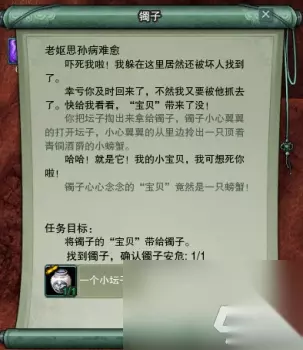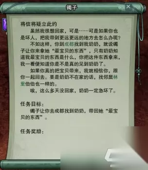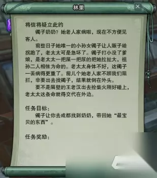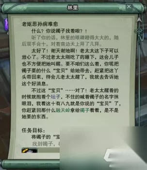 和林里对话交掉任务之后可知奶奶因为思念孙女生病了,让我们带一个坛子交给镯子: