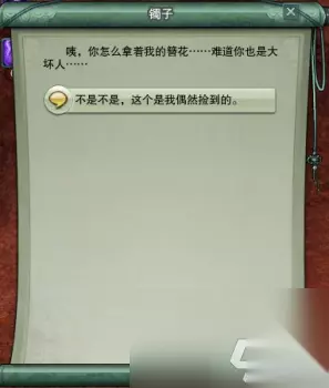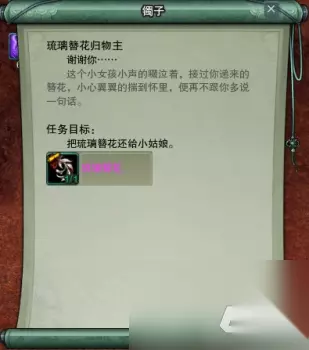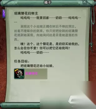 这个镯子是触发型NPC,就是说他不是一直都在这的,只有拾取了琉璃簪花的人才能够看到他。我们和镯子对话即可开启任务,同时琉璃簪花消失。个任务只要对话交掉即可: