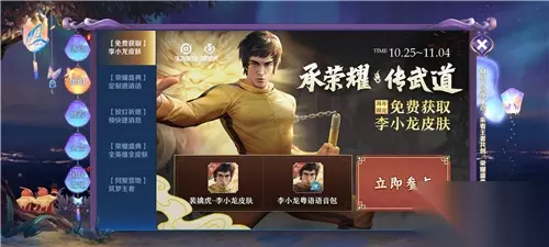 方式一:限时活动 1、10月25日-11月4日期间,有一个限时活动【免费获取李小龙皮肤】。 2、在里面打过第四关的主宰关卡,就能通过邮件免费领取李小龙皮肤宝箱。 3、开启宝箱后获取。(PS:李小龙升级三技能后才打得过,经验来自经验包和每日任务)。 方式二:碎片商店 10月28日10:30-11月11日,在皮肤碎片商店中,可以花费88皮肤碎片,直接兑换李小龙这款皮肤。