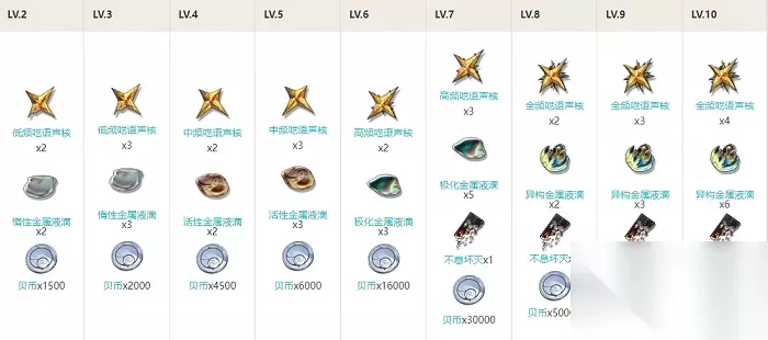 【共鸣回路】 Lv2:低频呓语声核x2+惰性金属液滴x2+贝币x1500 Lv3:低频呓语声核x3+惰性金属液滴x3+贝币x2000 Lv4:中频呓语声核x2+活性金属液滴x2+贝币x4500 Lv5:中频呓语声核x3+活性金属液滴x3+贝币x6000 Lv6:高频呓语声核x2+极化金属液滴x3+贝币x16000 Lv7:高频呓语声核x3+极化金属液滴x5+不息坏灭x1+贝币x30000 Lv8:全频呓语声核x2+异构金属液滴x2+不息坏灭x1+贝币x50000 Lv9:全频呓语声核x3+异构金属液滴x3+不息坏灭x1+贝币x70000 Lv10:全频呓语声核x4+异构金属液滴x6+不息坏灭x1+贝币x100000 一览图如下: