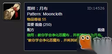 【魔兽】【世界】怀旧服月布【怎么】【获得】 在【魔兽】【世界】怀旧服中,裁缝专业的玩家【使用】【技能】【仪式:月布】后,【可以】将恶魔布转【化为】月布,【仪式:月布】【需要】【使用】【图样:月布】来【学习】,【图样:月布】【可以】从NPC琦亚处购买,NPC琦亚的【位置】位于冬泉谷的坐标(61.2,37.2)处。 【图样:月布】【介绍】 图样:月布 物品等级 55 【需要】 裁缝(250) 配方 裁缝 【使用】:教你【学会】净化恶魔布,并【将其】转【化为】月布。 "教你【学会】净化恶魔布,并【将其】转【化为】月布。"