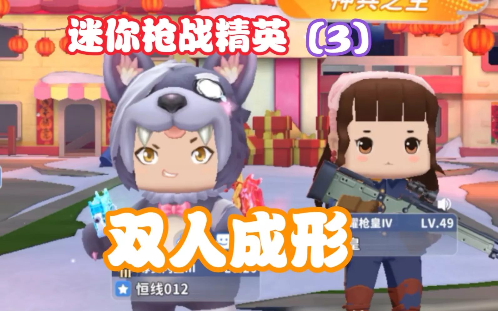 这是射击游戏《迷你枪战精英》的游戏内容展示,呈现了游戏主界面、等待对局及实战对战的画面,玩家使用双持UZI-冰焰双生枪械在卡通风格的地图中战斗,还能看到排位赛等多种游戏模式。
