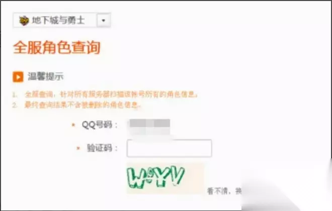 4、选择“全服角色查询”功能,输入验证码。