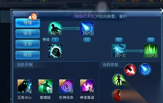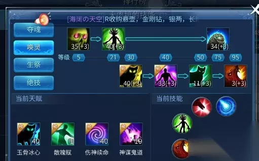 1. 离魂赋:单体攻击,对目标造成光伤害,并有概率使其失明,必须点满,前期后期都很用的着。 2. 柯壁问天:异人唯一群体攻击,对范围内目标造成光伤害,并有概率使其失明,必须点满,前期后期必用技能。 3. 大风歌:单体技能,对目标造成较高的风伤害并减少伤害值百分比的气血上限,后期技能可替代离魂赋当主要攻击技能,建议点高。 4. 碧血诀:这是个很有争议的技能,对目标可以造成很高的伤害,异人气血越少,伤害越高,但是耗费的法力多,而且施法距离只有4米,对远程输出系的异人来说是很不利的,所以建议随便点下就行,主要也是用来跟甲士PK用,但不一定打得赢。 唤灵篇