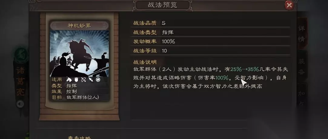 谋略战法是三国志战略版中基于智力属性计算伤害的特殊战法类型,与依赖武力值的兵刃战法形成鲜明对比。这类战法通常由高智力武将携带,通过策略性效果实现输出或控制,其核心机制在于战法发动后与敌方智力属性差值决定最终伤害量。谋略战法包含主动、被动、指挥等多种释放形式,其中瞬发型谋略战法如破军威胜落凤等因其无需准备回合的特点,在实战中具有更高的战术灵活性。谋略伤害受奇谋(谋略暴击)状态加成,但部分战法存在发动概率偏低或需准备回合的局限性,需通过特定武将或战法组合弥补稳定性问题。