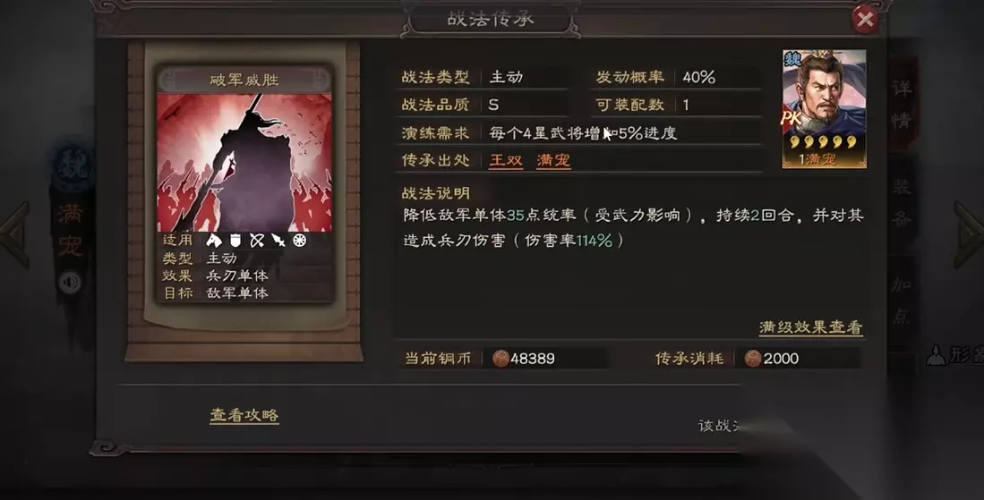 从战法设计逻辑来看,谋略战法往往附带特殊状态效果,如灼烧水攻沙暴等持续性伤害,或计穷虚弱等控制效果。这些状态存在覆盖机制:同类状态同时触发时,后发动的战法会刷新持续时间而非叠加效果。例如当两个灼烧类谋略战法先后命中同一目标时,仅保留后者的伤害数值和回合数。这种机制要求玩家在搭配阵容时需避免效果重复的战法组合,转而追求状态互补。部分顶级谋略战法如威谋靡亢兼具虚弱与叛逃双重效果,通过多段判定显著提升战术价值。