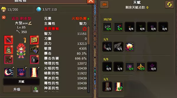5、这一套天赋主要就是最大化火焰伤害,通过上火种的方式提升伤害。 6、属性点方面,优先堆智力、暴击、爆伤和火伤,这四个属性都是能够影响角色输出量的,打一个极大化输出。