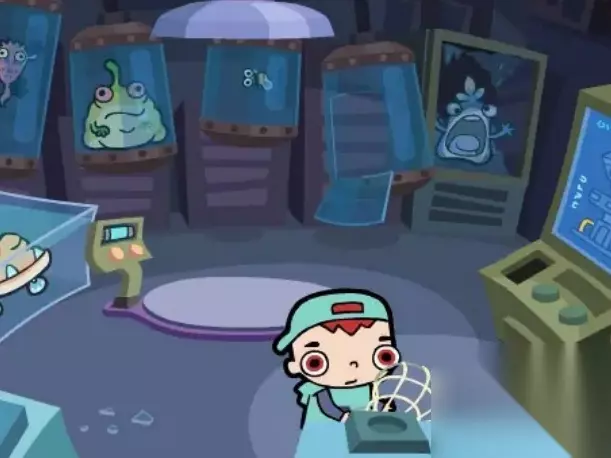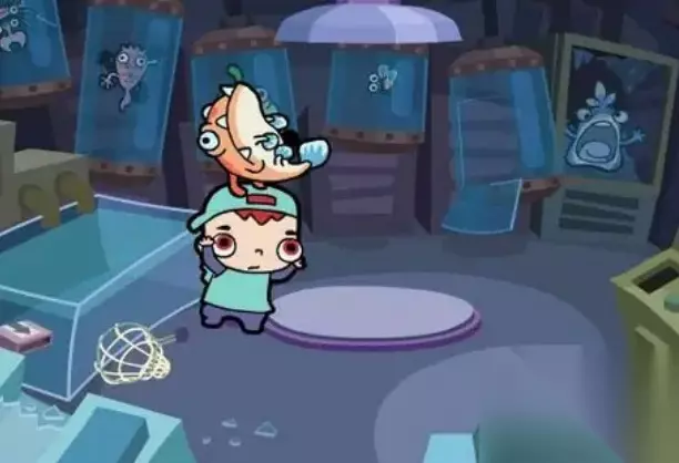 10、然后我们就用这网子将左边池子里怪物鱼给捞上来放进实验管道中