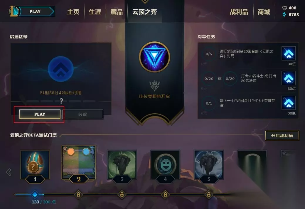 进入【云顶之弈】界面后,点击左侧【PLAY】进入房间。