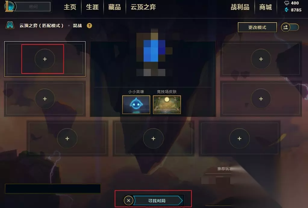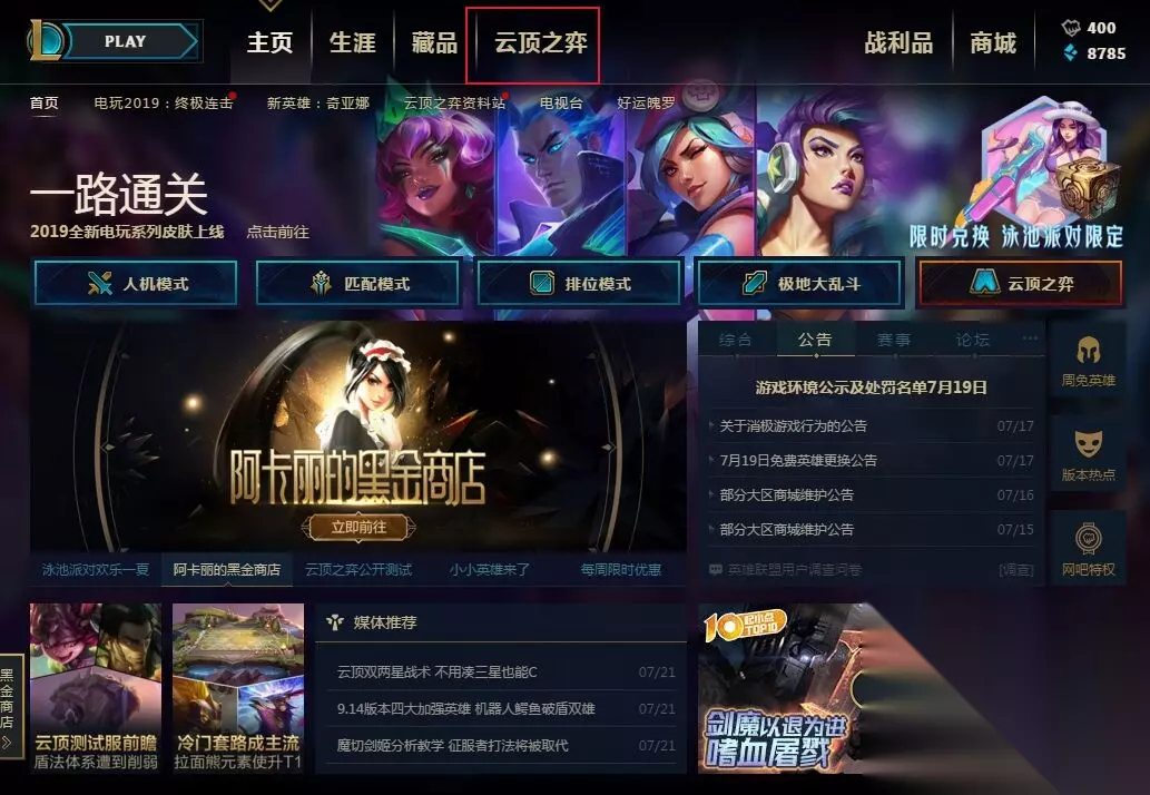 云顶之弈游戏入口在英雄联盟游戏主页内,如上图所示上方有一个【云顶之弈】模块,点击进入。
