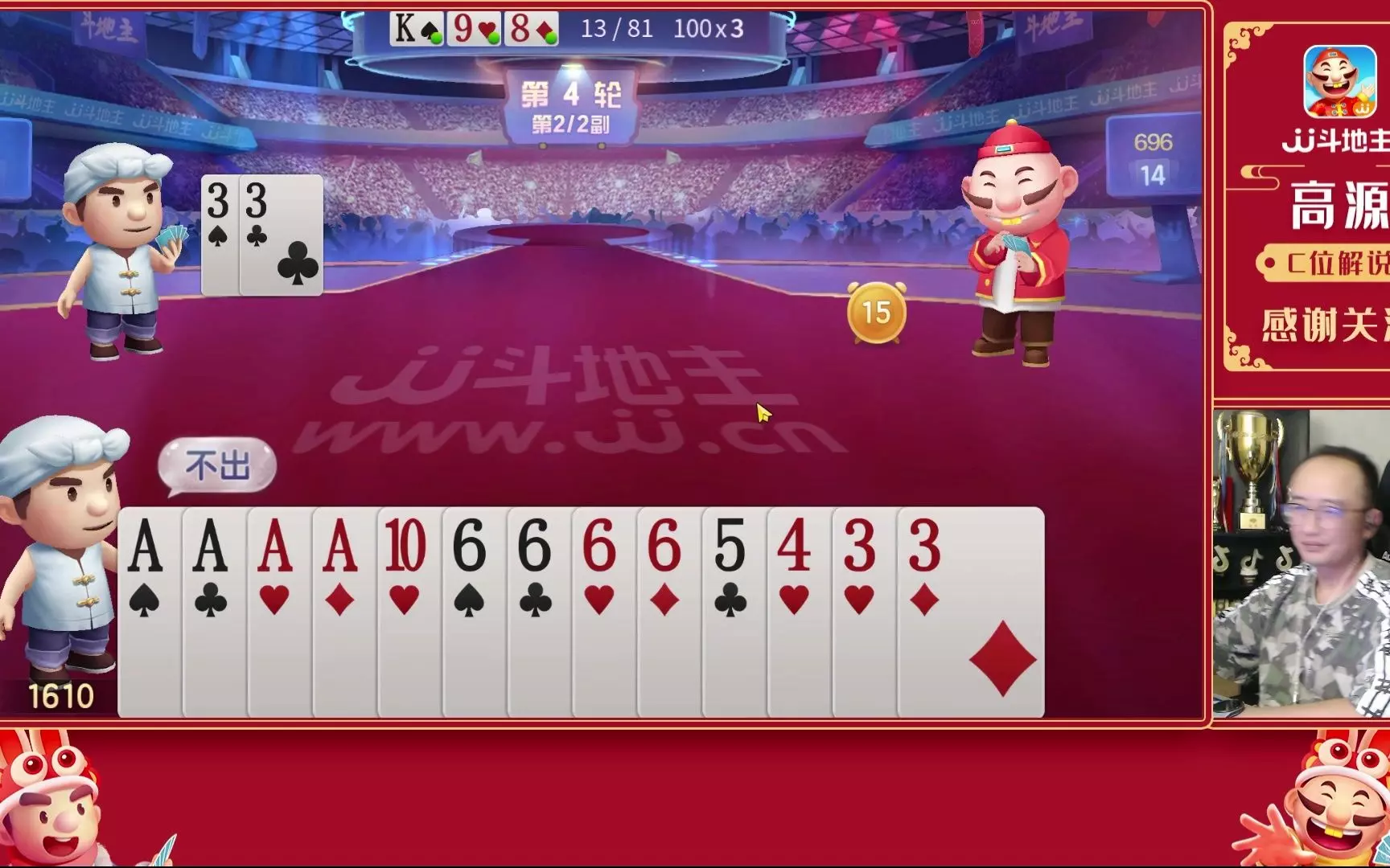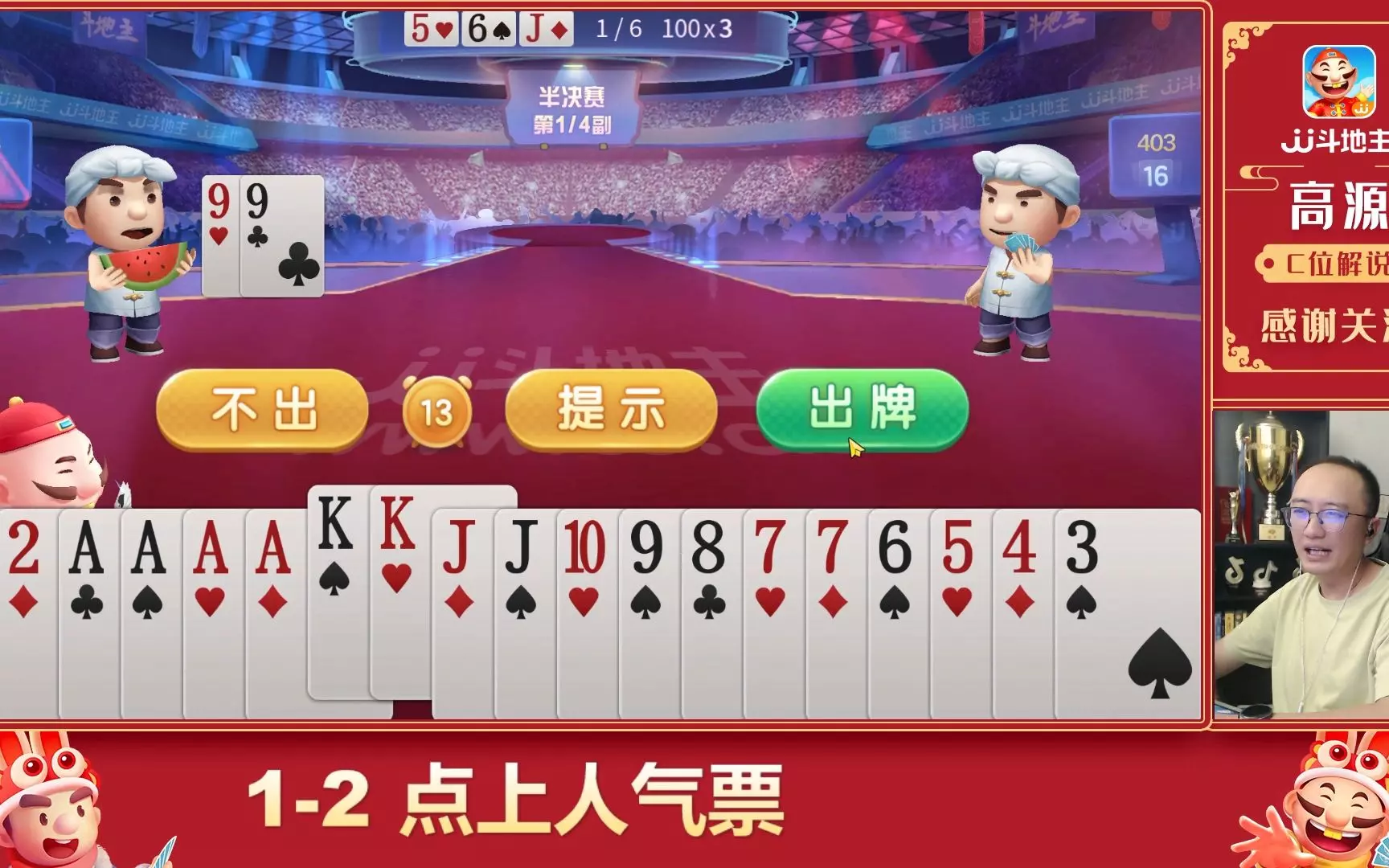 这是高源解说的JJ斗地主半决赛对局,展示了比赛中的出牌环节,高源在对局过程中进行解说,直播间还有观众互动送礼物,趣味调侃对局情况。