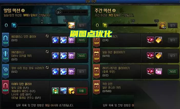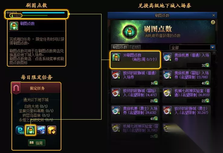 2、【刷图点优化】。当机械战神版本更新后,消耗疲劳值时,不再获得刷图点,改成每日限定任务,可以获得10点刷图点。目前仅仅拆包,体验服没放任何东西,以韩服为例给玩家展示一下,改版后的限定任务便利性优化,以及刷图点数获取。
