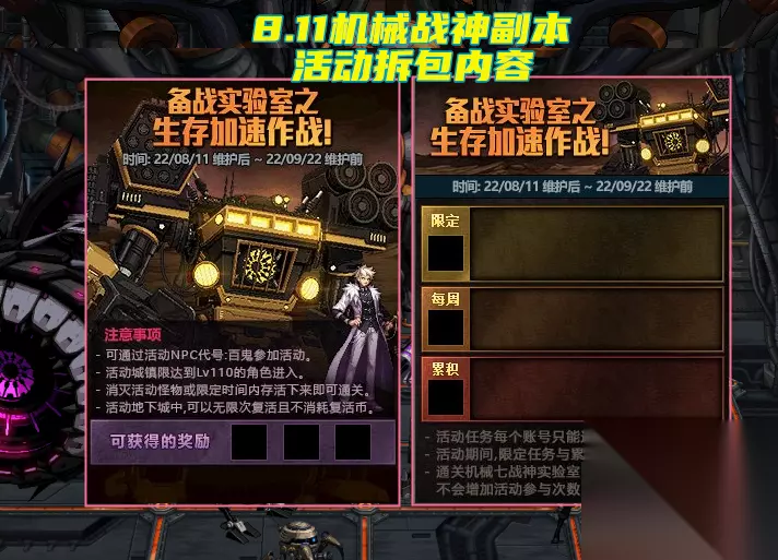 7.22体验服拆包更新,透露出了机械战神实验室配套活动,只是“天界”开服后,没有实装任何新内容。不过已经基本确定,8.11推出机械战神副本,玩家早就摩拳擦掌了!