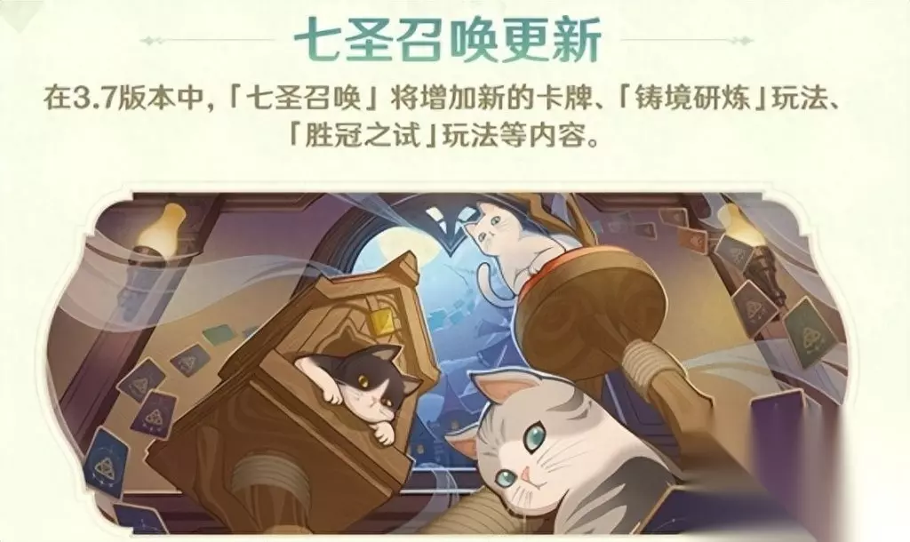 主线剧情层面没有很大的推进。宵宫传说任务开启《琉金之章·第二幕》,新增卡维邀约任务。 这3.7版本,我是一刻也待不下去了!(小提一梗:“这xxx我是一刻也待不下去了”常形容玩家在长草期对于新版本内容的迫切期待!此处非贬义~) 但牌佬们又有福啦!“七圣召唤”在本次迎来了超大更新!“胜冠之试”、“铸境研炼”新模式来袭,大量全新卡牌亮相。