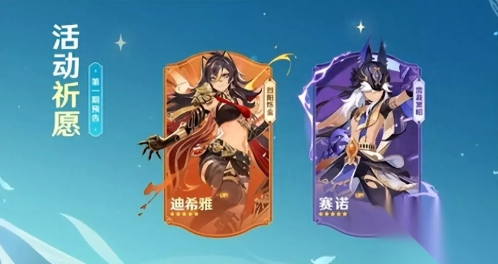 该版本中的卡池角色很有特点!第一期UP卡池中有两位黑皮美女帅哥,分别是全新五星角色迪希雅和赛诺;