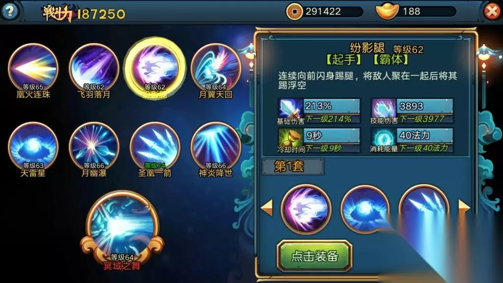 纷影腿 唯一的近战技能,瞬发且带有霸体效果,不得不说是脱离对手控制(逃跑)的好技能。对手一近身,即可直线穿到对手背后并拉开距离,接上陷阱技能天雷星。而空中释放可将对手上下吊打,不得不赞。 月幽瀑 个人并未发现其所介绍的控制作用,但是可做起手技能。释放时前踢击退前方目标可聚怪,同时后退一步拉开与其的距离,属于大范围AOE高伤持续技能。