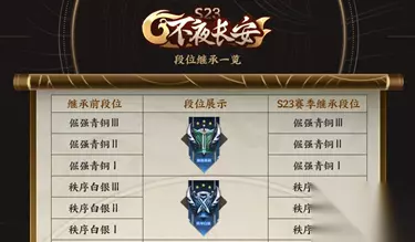 s23赛季的段位继承如图所示,你可以仔细看看细节,其实本赛季的段位继承表也很相似。我们需要关注的是,钻石板块下个赛季将落入白金,钻石一掉5颗钻石,无论有多少颗星星,星星的光芒都会落到钻石上。