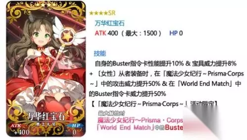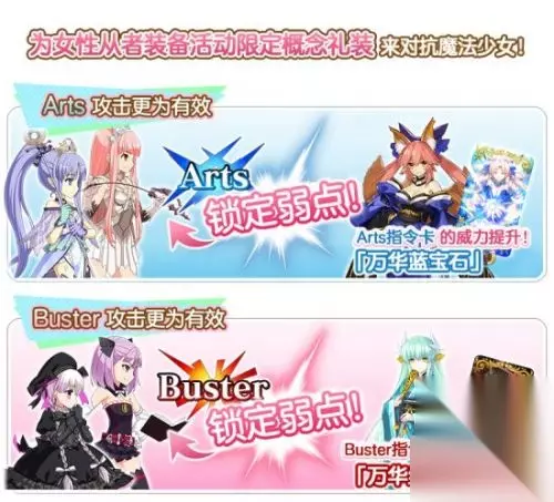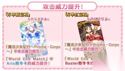 ◆有效率的攻略方法・其2◆ 本次活动只有女性从者能获得对抗魔法少女的力量。 通过兑换、关卡奖励、任务奖励所获得的活动限定概念礼装「万华红宝石」「万华蓝宝石」,可以通过给女性从者装备,来提升在「魔法少女纪行~Prisma·Corps~」中的攻击威力! 并且在「World End Match」中,分别对指令卡有威力UP的效果。