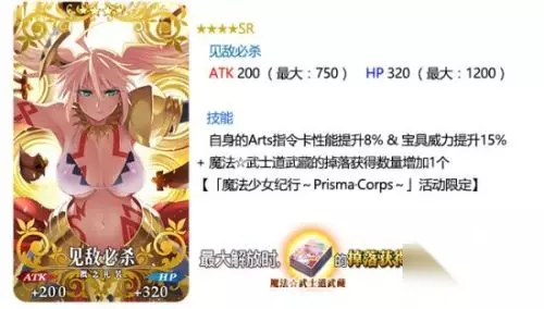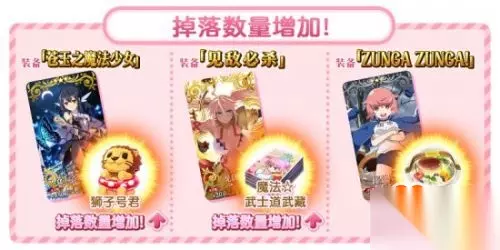 装备活动限时概念礼装, 可分别提升活动道具「狮子号君」「魔法☆武士道武藏」「高级布丁」的掉落获得数量。 ※各关卡中的道具掉落率并非100%,敬请注意。