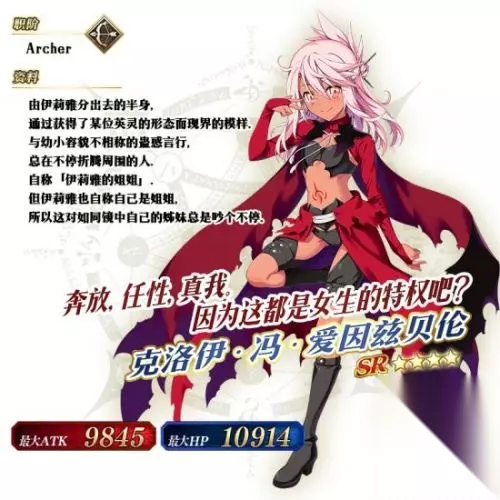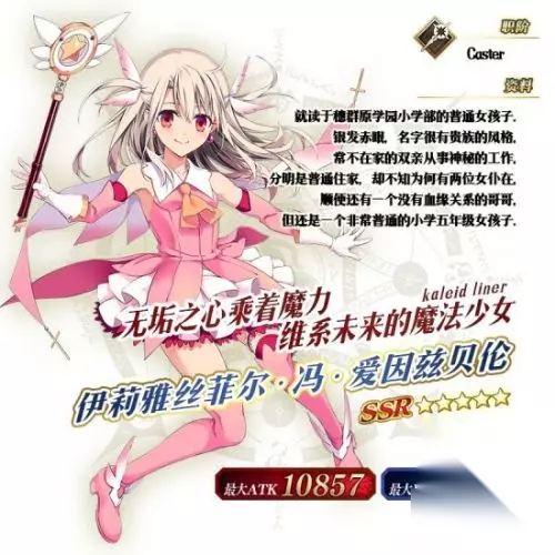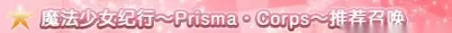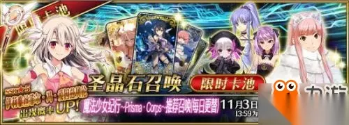 ◆「魔法少女纪行~Prisma·Corps~推荐召唤」◆ 活动时间:2017年10月20日 维护后 ~ 11月3日 13:59 作为联动纪念,「魔法少女纪行~Prisma·Corps~推荐召唤」卡池限时开启! 「Fate/kaleid liner 魔法少女☆伊莉雅 3rei!!」中的女主角「伊莉雅丝菲尔·冯·爱因兹贝伦」将作为从者「★5(SSR) 伊莉雅丝菲尔•冯•爱因兹贝伦」限时登场! 同时,在活动中大放异彩的从者「★5 (SSR) 女王梅芙」将与其通过每日替换的方式进行出现概率提升! 活动期间内「★4(SR) 美狄亚〔Lily〕」「★4(SR) 童谣」「★4(SR) 海伦娜·布拉瓦茨基」将一直提升出现概率。 本次召唤为配合活动主题,只会出现女性从者。具体细则请参阅圣晶石召唤界面左下方的「召唤详情」页面。 ※伊莉雅丝菲尔·冯·爱因兹贝伦在本次推荐召唤结束后,将不会加入剧情卡池。 通过装备限时概念礼装「★5(SSR) 苍玉之魔法少女」「★4(SR) 见敌必杀」「★3(R) ZUNGA ZUNGA!」可提升活动道具的掉落获得数量。 推荐召唤期间,限时从者,限时概念礼装出现概率提升! 10连召唤可至少获得1枚四星以上(含四星)卡牌,以及1骑三星以上(含三星)从者! ※保底的四星卡牌包括从者及概念礼装。 ※本召唤中的「出现概率UP」所指的是,与其他相同稀有度的从者、概念礼装相比,拥有更高的出现概率。 推荐召唤日期每日更替从者 10月20日 维护后 ~ 10月26日 23:59伊莉雅丝菲尔·冯·爱因兹贝伦 10月27日 00:00 ~ 10月27日 23:59女王梅芙 10月28日 00:00 ~ 10月28日 23:59伊莉雅丝菲尔·冯·爱因兹贝伦、女王梅芙 10月29日 00:00 ~ 10月29日 23:59女王梅芙 10月30日 00:00 ~ 11月3日 23:59伊莉雅丝菲尔·冯·爱因兹贝伦 ※每日更替的推荐召唤从者会变化,敬请注意。 ※美狄亚〔Lily〕、童谣、海伦娜·布拉瓦茨基在本次推荐召唤期间,一直都是出现概率提升对象。 ※每日更替的推荐召唤从者对主线剧情的通关进度没有要求。