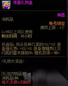 活动期间,勇士们每天都可以在商城中免费购买1份特别礼物,可以从疲劳值上方的活动图标直接进入商城内的购买界面。 奖励内容 惊喜礼物盒开启后,将从各种几率的+11/+12装备强化券,+10/+11装备增幅券以及闪亮的雷米援助中,随机获得一种。 惊喜礼物礼盒会于每天凌晨06:00删除。