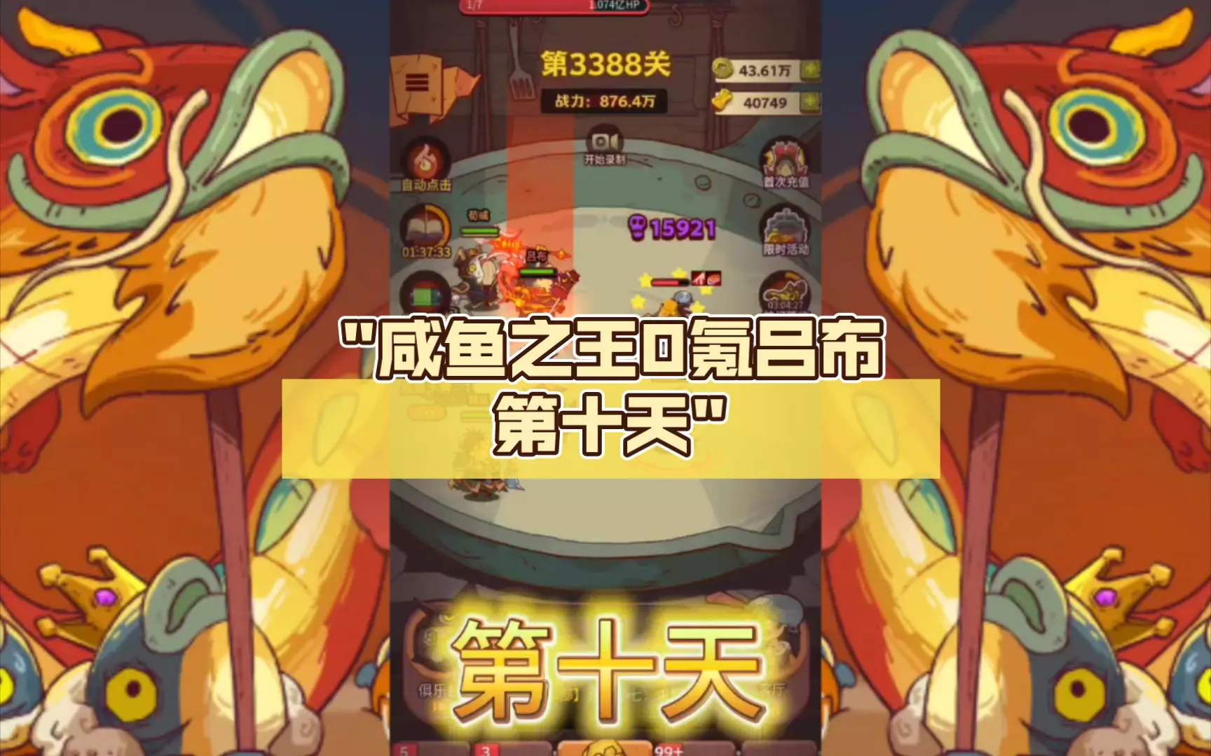 这是《咸鱼之王》0氪吕布玩法的第15天内容,讲解了推关和爬塔的常用阵容,展示了玄铁10塔爬塔、第3618关推关的战斗画面,还有阵容布阵、战力提升的相关操作,助力玩家通关。