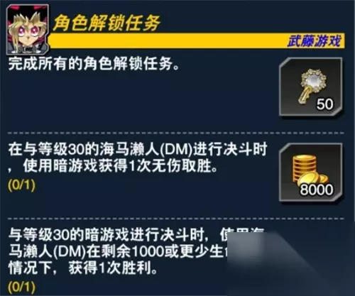第一个任务是使用暗游戏,无伤打赢30级的海马濑人。第二个任务要用海马濑人,在剩余生命值低于1000的情况下,打赢30级的暗游戏。海马濑人和暗游戏,都是在DM世界15级的时候解锁。