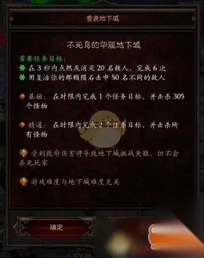 《暗黑破坏神3》法师不死鸟套套装地下城要求玩家在3秒内点燃或消灭20名敌人,用复活你的那颗陨石击中50名不同的敌人,可能有些玩家还不知道不死鸟套套装地下城在哪,该怎样完成,现在小编带给大家法师不死鸟套套装地下城精通攻略,希望对大家有所帮助。 法师不死鸟套套装地下城精通攻略 1、入口信息及通关要求 凄凉沙漠靠近佐敦库勒藏书馆入口附近