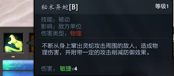 7、秘术异蛇B:持续攻击周围,造成物理伤害减甲