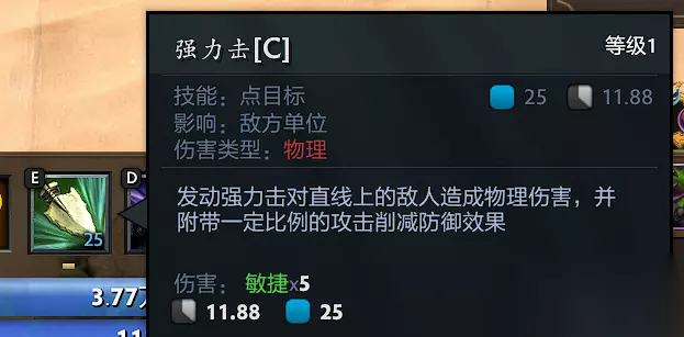 3、强力击C(2星):主动直线物理伤害