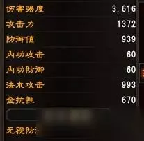 我们再来算一下X = 30和40时候: 普攻伤害(30)=(1372 - 1015*0.83)/2+30)*1.7434*3.616=1858.30 普攻伤害(50)=(1372 - 1015*0.83)/2+50)*1.7434*3.616=1984.38 从图中发现算出的1858-1921-1984,比图中值稍微偏高那么一点点,(图中有个爆伤为1590是因为,我用奶妈在给自己加血套上了护盾抵消了700多伤害)。 由于这里的X=40是当我之前带上披风和暗器后裸攻为1415时测试出来的值,此时攻击为1372,这个X此时可能会略小于40,这样就能说的过去了。 下面再进行测试,内功攻击与防御。带上右边的官阶将军之印,攻击+2,内功攻击+40点。 先来公式计算: 普攻伤害(40)=(1374-1015*0.83)/2+30)*1.7434*3.616+40=1967.64