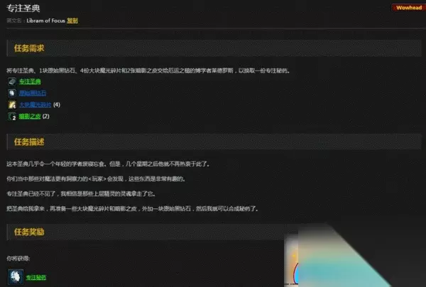 专注秘药 作用:在头盔或者腿部永久增加8点魔法效果 需要的材料:1本【专注圣典】、1块【原始黑钻石】、4份【大块魔光碎片】和2张【暗影之皮】 防护秘药 作用:在头盔或者腿部永久增加1%回避 需要的材料: 1本防护圣典 1块原始黑钻石 2份大块魔光碎片 1张磨损的憎恶缝纫线 急速秘药 作用:在头盔或者腿部永久增加1%近战攻击速度 需要的材料: 1本防护圣典 2.原始黑钻石×1 3.大块魔光碎片×2 4.英雄之血×2 秘药任务需要去厄运北,在菲拉斯营地接任务跑厄运北图书馆开个尸体,回去交任务后,即可在图书馆内完成3种秘药任务了。 当然祖格没开的时候,也可以单独做这3种秘药给头腿附魔,当然属性是比不上祖格的头腿附魔的