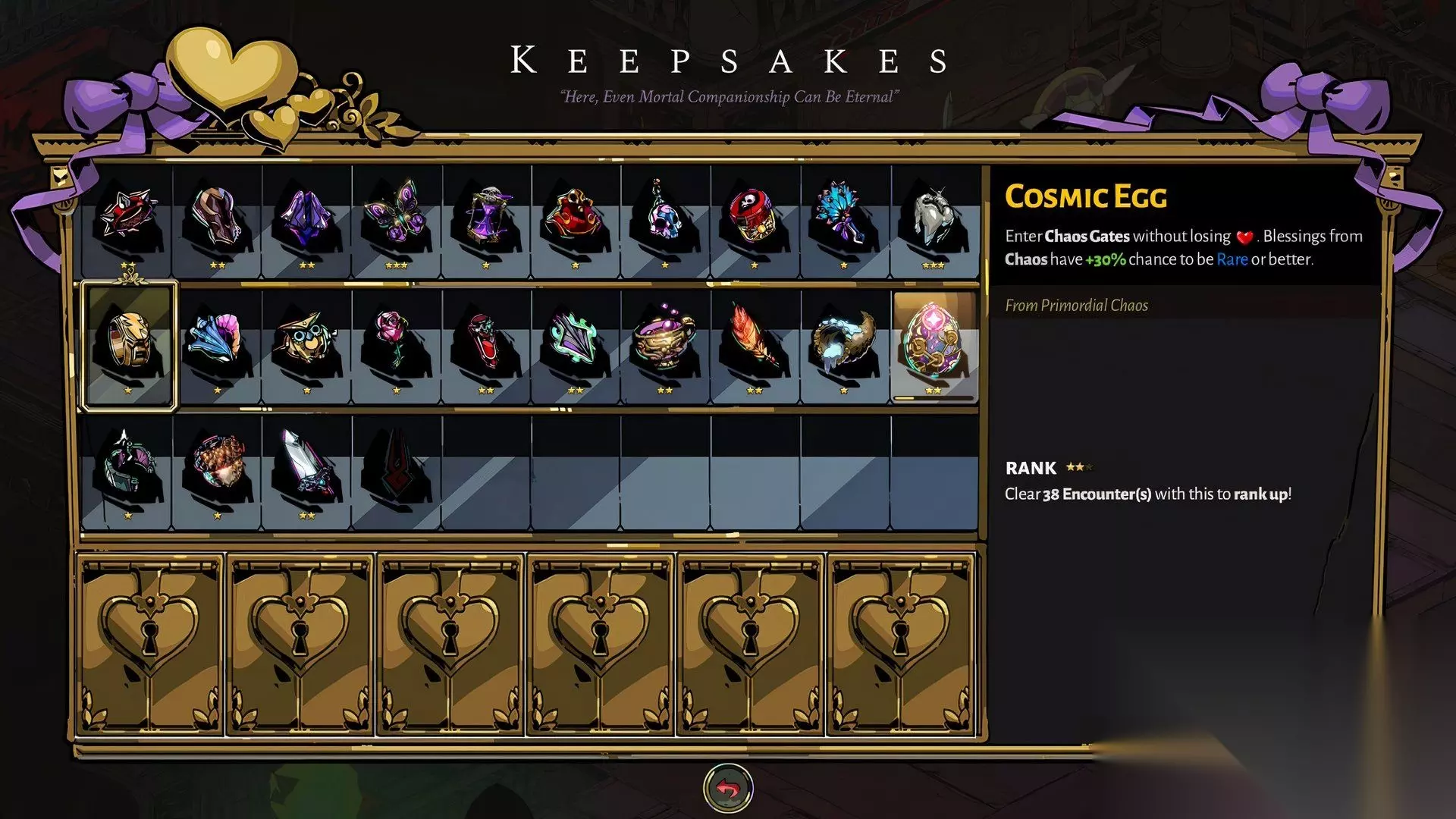 除非你在《黑帝斯》中追求特定的流派,否则有很多比奥林匹斯众神赠送的信物更好的选择。虽然它们对于完成“命运清单”的任务(或达成那几乎不可能的 100% 完成度)很有帮助,但也仅此而已。 此外,虽然它们对于确保获得特定神的恩赐以配合特定流派(例如狄俄尼索斯的“烈性酒”来提高生存能力)很有用,但并不能保证你一定能得到所需的特定恩赐;与此同时,你本可以使用更有益的信物来完善你的流派,而无论你最终获得什么恩赐。 当你开始冒险时,有许多更好的信物可以搭配。此外,如果你尝试“无恩赐挑战”,那么这些信物将从毫无用处变成彻头彻尾的累赘。无论你多么喜欢特定的神,他们对你的态度都是一样的,这确实有点可惜。 16 宇宙之卵 (Cosmic Egg)