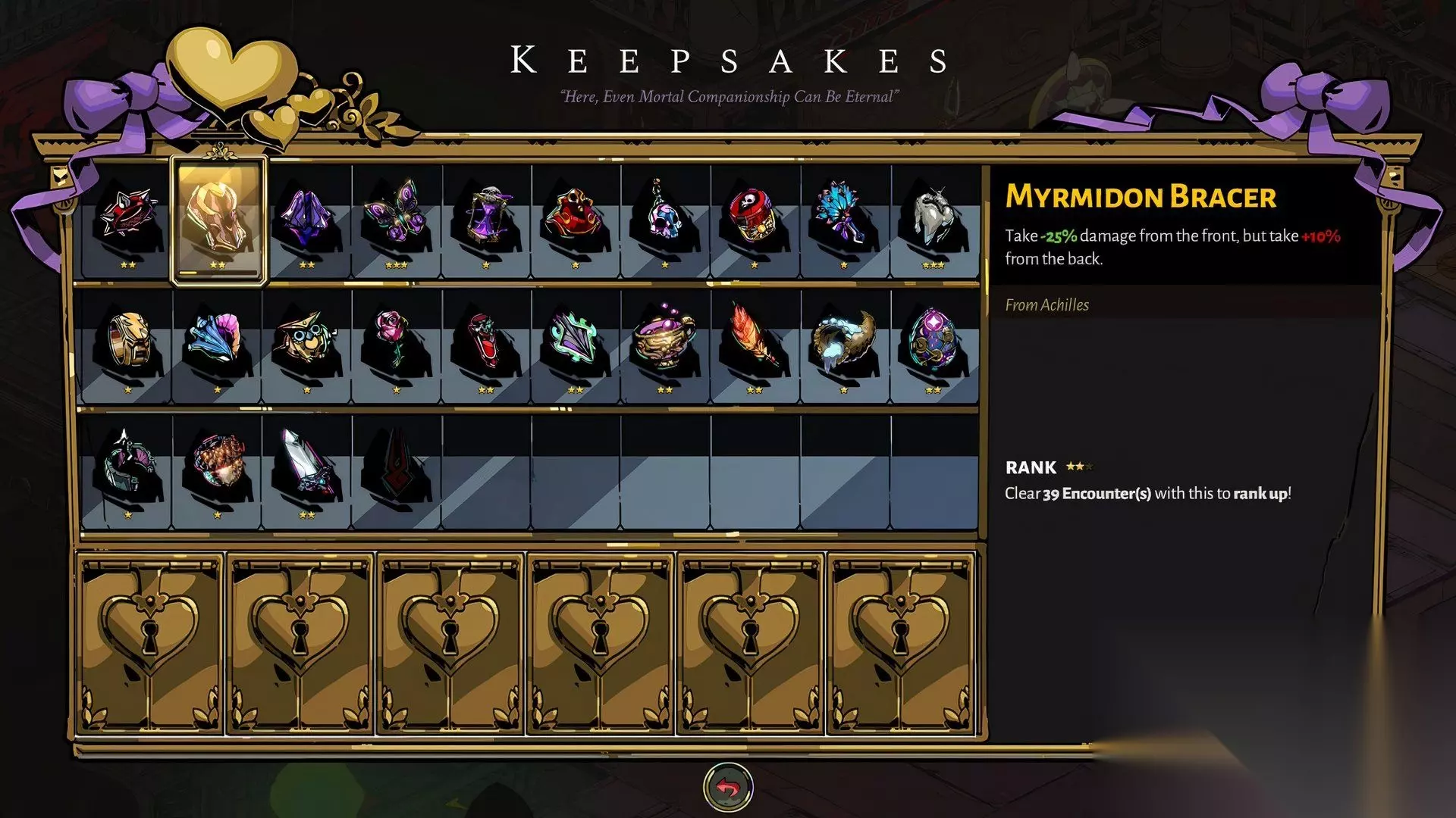 西绪福斯对众神颇有微词,这一点从他的信物效果就能看出来。如果你正在进行无恩赐挑战,这绝对是你应该考虑携带的信物之一。不幸的是,大多数时候你可能不会进行无恩赐挑战。 尽管如此,在闯关的早期阶段至少尝试一两次还是值得的——例如,你可以先专注于提升扎格柔斯基础属性的恩赐,然后在击败墨盖拉后更换信物。 伤害提升非常显著,在冥府之镜和强化武器的加持下,它变成了一个相对有用的信物。 13 密耳弥多恩护腕 (Myrmidon Bracer)