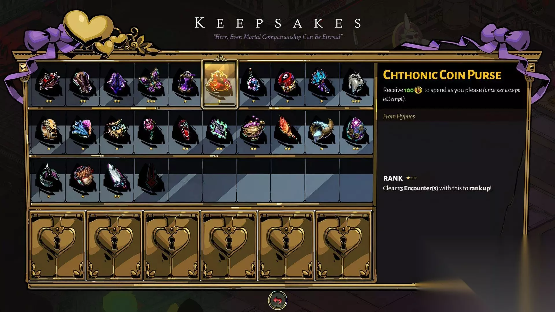 在向冥河船夫卡戎赠送蜜露后,他会给扎格柔斯骸骨沙漏。当你从各处的卡戎之井购买道具时,它在消失前会有固定的持续遭遇次数。这个信物会增加这些道具的持续次数。一级增加 4 次,二级增加 6 次,最终等级将增加 8 次遭遇。 如果应用得当,这可能成为胜利与失败的分水岭。卡戎之井的一些道具能为扎格柔斯提供击败 Boss 所需的优势,但它们可能会在到达 Boss 房间前耗尽。骸骨沙漏可以确保效果持续足够长的时间。 10 冥界钱袋 (Chthonic Coin Purse)