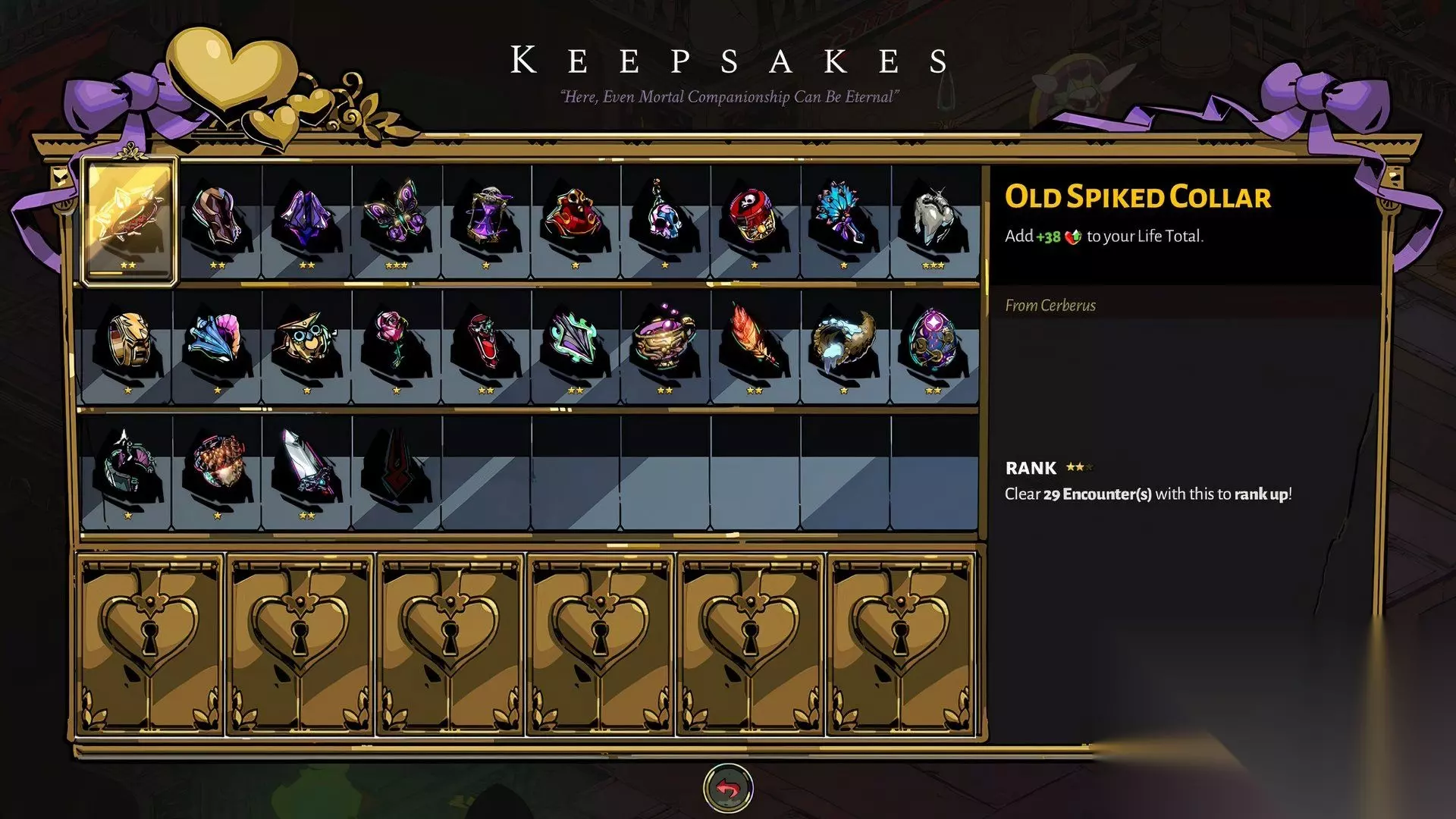 有时,制胜策略就是将扎格柔斯的生命值提升到巨大水平,使他成为战场上的坦克,即使这意味着牺牲一些进攻能力。半人马之心是实现这一目标的主要方式,可以增加扎格柔斯的总生命值。 然而,旧尖刺项圈是另一种延长你在冥界穿梭时间的绝佳方式。尖刺项圈每升一级,你都会获得更多生命值,想到这一点还挺温馨的——这代表刻耳柏洛斯想要确保你能顺利到达斯堤克斯神庙(Temple of Styx)见到他,而不是过早地回到冥府。 仅仅 50 点额外最大生命值在某些情况下可能会让旧尖刺项圈显得平庸,但那额外的一点生命值往往决定了你是否会在面对哈帝斯最终 Boss 前被迫消耗宝贵的死里逃生(Death Defiance)。