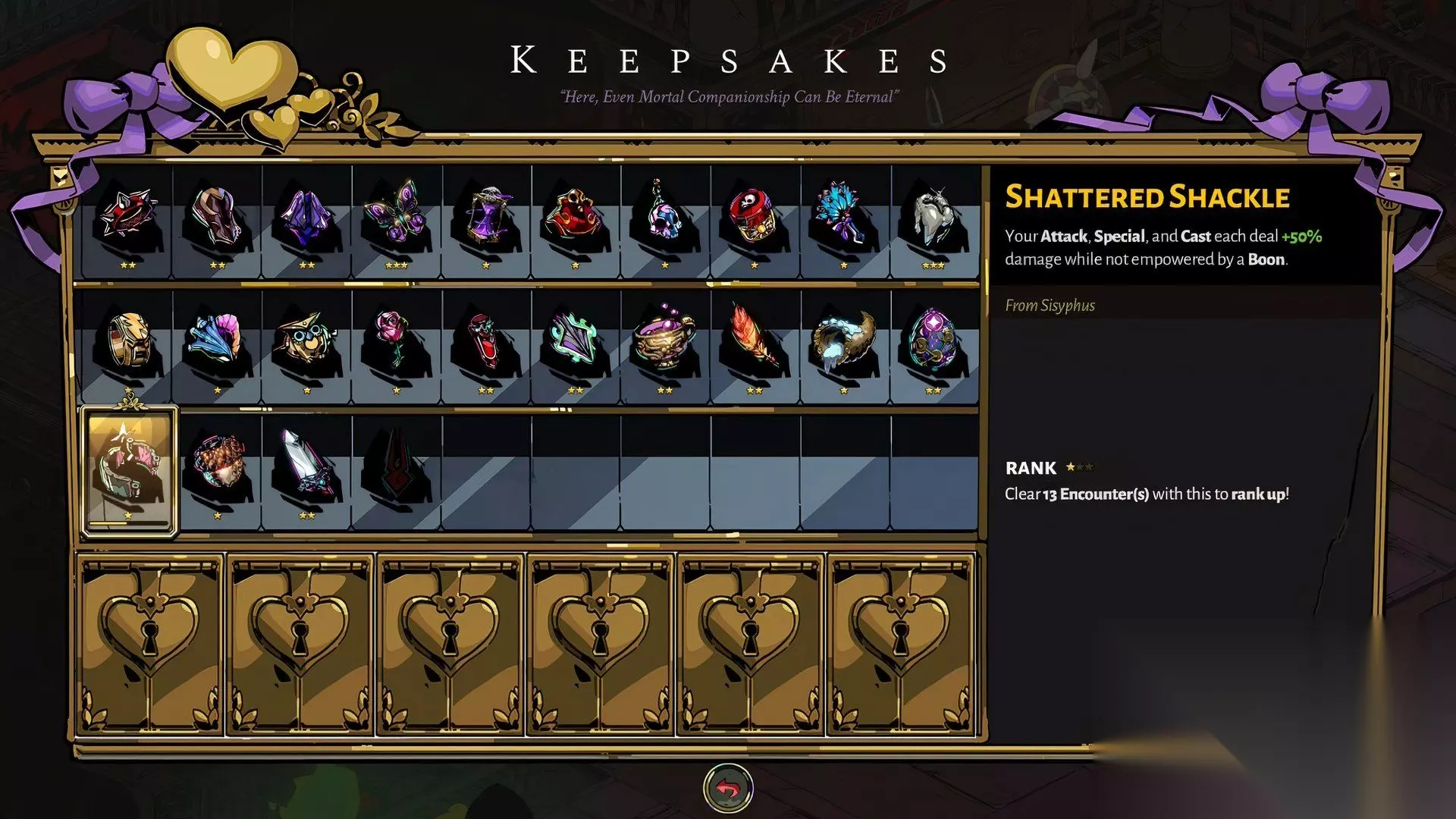 当你第一次击败墨盖拉后,她会出现在冥府。从那时起,击败她后她偶尔会出现。一旦她开始在冥府逗留,你就可以赠送她蜜露。作为回报,她会给你骷髅耳环。 这个信物会让你在生命值低于最大值的 35% 时造成额外伤害。随着等级提升,伤害加成也会增加。一级时提供 20% 额外伤害,二级提供 30%,最高级则提供高达 40% 的额外伤害。 墨盖拉的信物是一个相对直接的信物,在背水一战时确实能提供有用的战力提升。尽管如此,骷髅耳环排名较低的原因在于其收益在大多数情况下都很短暂——因为你首先必须处于低血量状态才能激活它。 14 破碎的枷锁 (Shattered Shackle)