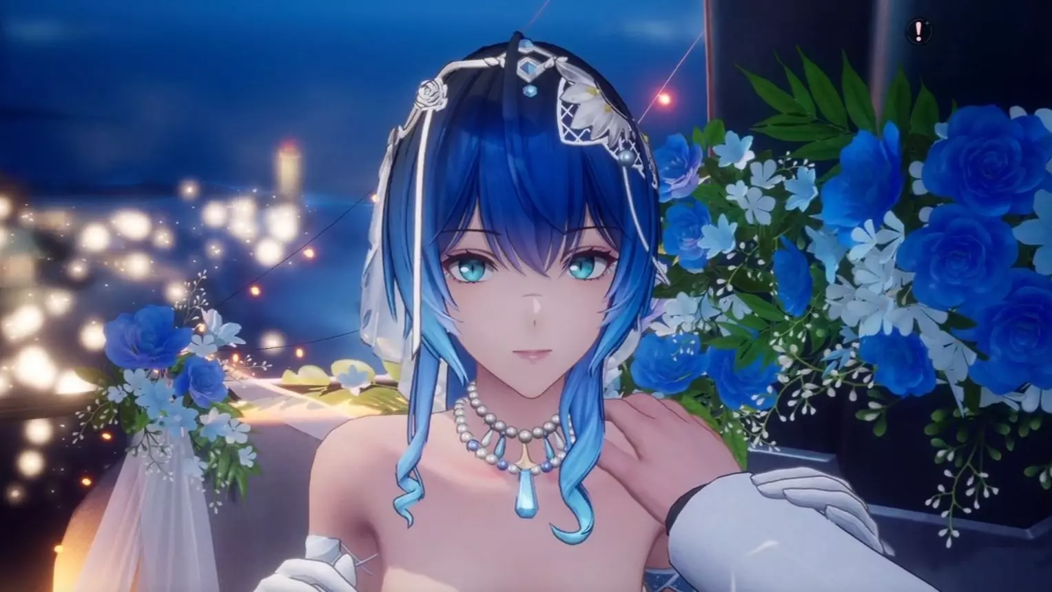 这是游戏《尘白禁区》里凯茜娅-狂诗(星抚恋音)的互动场景④,场景中凯茜娅身着特色服饰,在布置有蓝花的吧台旁,与玩家互动,提议尽情庆祝,还营造仪式感碰杯,展现了该角色的互动剧情。