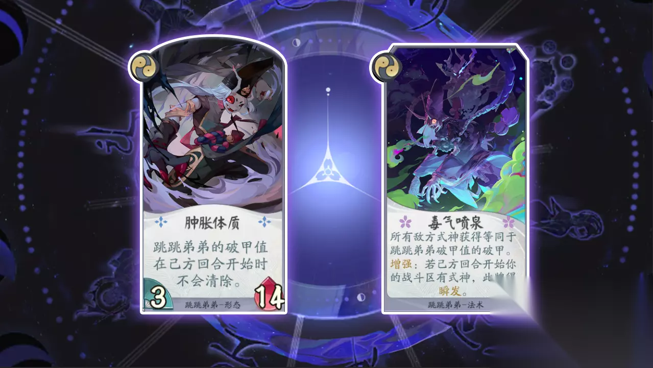 卡牌携带推荐 跳跳弟弟:腐坏直拳 (1) 瘴疠体质 (1) 毒气喷泉 (2) 肿胀体质 (2) 觉醒·跳跳弟弟 (1) 甜蜜的负担 (1) 凤 凰 火:凤鸣 (2) 瑞翔 (2) 焚羽 (1) 凤火 (1) 引燃 (1) 觉醒·凤凰火 (1) 大 天 狗:黑羽之刃 (2) 暴风之主 (1) 天狗风乱 (1) 风神一扇 (1) 羽刃暴风 (2) 觉醒·大天狗 (1) 萤 草:吸取 (2) 治愈之光 (1) 闪烁 (1) 安魂之光 (1) 虹彩 (1) 觉醒·萤草 (1) 萤火点点 (1) 配卡思路 跳跳弟弟:本局中他的主要作用是给敌方所有式神造成破甲,所以“肿胀体质”和“毒气喷泉”这两张核心牌都要满编,带两张“肿胀体质”是因为形态牌气绝后会消失,同时带两张可以增加容错率,也增加了抽到这张牌的几率。
