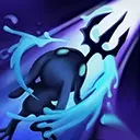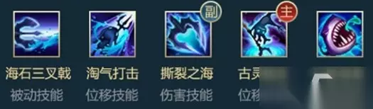 技能2:撕裂之潮 强化下一次普通攻击,在目标周围冒出海水,造成50额外魔法伤害,并对命中的敌人施加海石三叉戟。接下来5秒内的普通攻击都将被强化,可造成10额外魔法伤害。 若第一次被强化后的普攻成功击败目标,该技能的冷却时间将减至1秒。