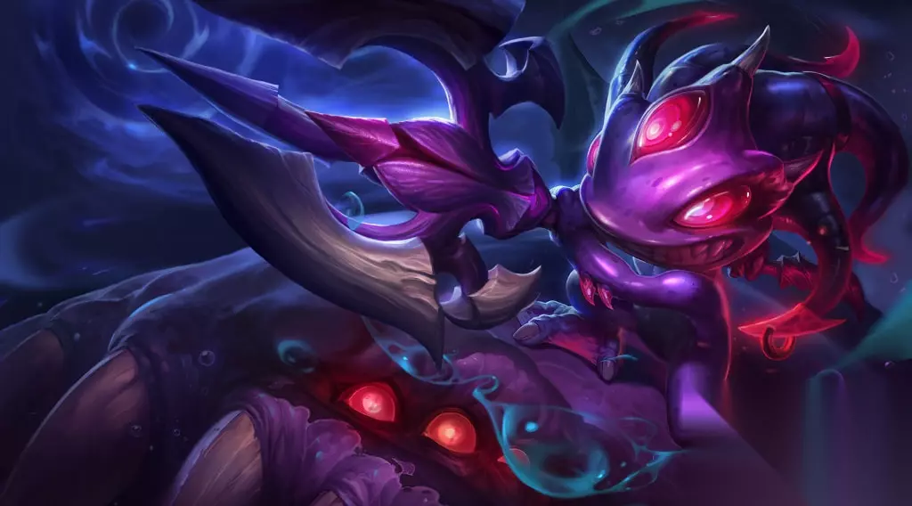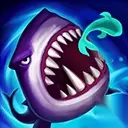 大招:巨鲨强袭 放出一条小鱼来,它会依附并显露命中的第一名英雄,并在2秒后吸引一条鲨鱼来击飞目标及其附近的敌军。小鱼的移动距离越远,引来的鲨鱼就越大,视其移动距离,最终将造成150至350的魔法伤害,并使被命中的敌人移速降低40%至80%。