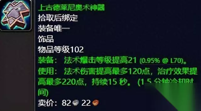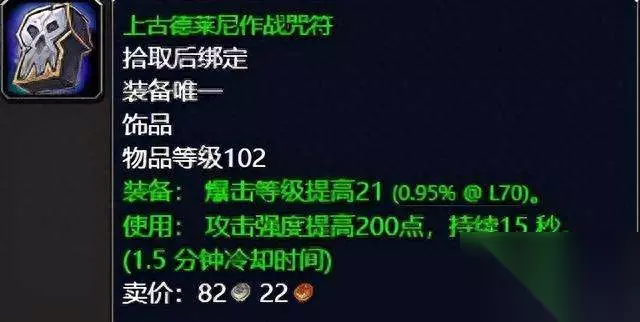 上古德莱尼作战咒符 作为被燃烧军团追杀出外域的种族, 崇尚圣光的德莱尼可谓在上古的德拉诺是相当的厉害的,而他们所遗留到现在的神器依旧熠熠生辉等待你的使用。这两个上古德莱尼奥术神器和上古德莱尼作战咒符可以说是法系和物理DPS的爆击提高神器饰品了,虽然都是绿色装备,但是我想懂行的玩家已然在惊呼它们的非凡属性与装备效果了。15秒的持续时间1.5分钟的冷却C值得任何法系输出和物理输出去拥有它们,前期极品饰品你值得拥有,推荐指数满天星辰。 ②任务《巨大的骨虫》。(系列任务,起始任务《挖掘行动》) 任务要求:白骨荒野沙塔尔前哨站的杜瓦弗维兹要你找回巨虫的内脏。