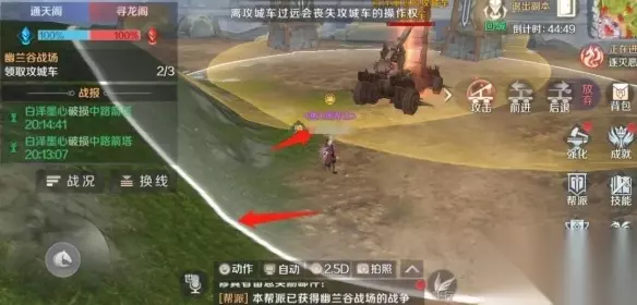 ② 准备时间 开启战场之后5分钟为准备时间,5分钟之后将会取消空气墙,正式开启城战。 ③ 分线规则 战场开启时,一个战场会以双方帮派参战人数更多的一方为准开启分线,人数越多,分线越多。 分线一旦开启,在战争途中不会增减。对于一方,同一条分线,最多只能进入36名人员。 切换分线和回城共CD,不同分线中水晶和塔共用血量,并且随着分线数的增多,双方水晶和塔的血量也会相应增加。 由于每条分线的箭塔和水晶公用血量,如果帮派决定开多条分线,需要修真者在每条线路上都不能大意,以避免水晶被偷。同时每条分线都可以领取3辆攻城车供修真者们驱使(一辆坏了才能领取下一辆,记得哦~)。 ④ 攻城车规则 攻城车为整个城战的核心,需要修真格外重视。 领取攻城车:对于拥有领取权限职位的修真者(帮主可以进行调整,默认堂主就可以领取),可以和NPC对话领取攻城车,领取到攻城车的修真者,可以在攻城车称号看到相应提示,自己头顶也有箭头特效标明。