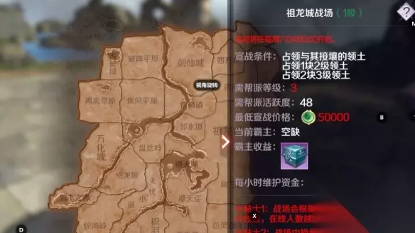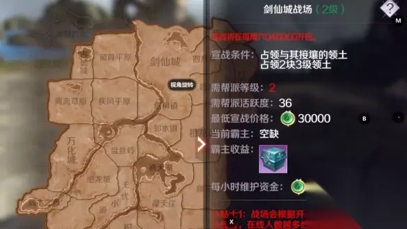 ④ 领土前提条件 没有领土的帮派,可以宣战任意三级领土; 有领土的帮派,只能宣战接壤自己帮派的领土; 宣战二级领土,需要占领至少两块最低三级领土; 宣战一级领土,需要占领至少两块最低三级领土,需要占领至少一块最低二级领土。(占领了一块二级领土和一块接壤一级领土的三级领土,可总计占领两块领土,即可对一级领土宣战。) 领土数量限制:一个帮派每周所能拥有以及宣战的领土总数和帮派等级有关,具体宣战的领土数量需要修真者根据实际情况来进行宣战哦~(1-3级帮可宣战1块;4-5级可宣战2块;6-7级可宣战3块;8-9级可宣战4块;10级5块)。 ⑤ 宣战资金条件 不同等级的领土,宣战要求的最低资金不同,分别为: 三级领土:最低要求帮派资金10000 二级领土:最低要求帮派资金30000 一级领土:最低要求帮派资金50000 3.宣战规则 满足宣战条件的帮派,有宣战权限的修真者,可以在领土界面,选择自己可以宣战的非己方领土进行出价。对于出过价的帮派,有一次加价的机会,加价之后的出价为最终出价。宣战权限默认为帮主、副帮主,帮主也可以赋予其他人权限。