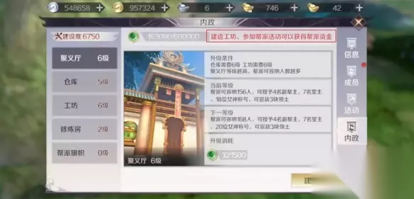 有主领土,所有出价帮派中出价最高者获得这个领土的战争权;无主领土,所有出价帮派中出价最高与次高获得这个领土的战争权,且出价最高的帮派为防守方,次高者为进攻方。 在这里呆毛还需要郑重提醒各位修真者:输掉城战的帮派,帮派资金是不退还的(竞价失败也是不会退还的哦)!还请各位修真者把握好对手实力,深思熟虑之后再做出相应的对策! 4.关于竞价 很多修真者会问,竞价用什么竞价呢?呆毛来和大家说一下,其实上文已经提到了,就是帮派资金。 帮派资金主要靠各位修真者在平时的帮派任务和活动中获得,比如完成疯狂的石头、帮派神兽、帮派联赛等活动都可以增加帮派资金;工坊的自动运转也会增加帮派资金。