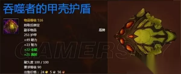 吞噬者布罗克位于霜火岭中部,龟裂平原西侧的熔岩池附近,周围有几个怪物守卫。击败布罗克后,可以获得吞噬者的甲壳护盾,这是一件提供516智力的盾牌。