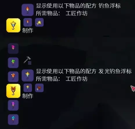 获取方式: 钓鱼浮标由渔夫任务给予 发光钓鱼浮标 需在 工匠作坊,使用 钓鱼浮标 + 坠落之星 合成