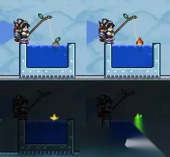 增加10渔力,替换钓鱼浮标样式 除了最普通的钓鱼浮标,其他浮标都会发光 依次为: 不装备浮标、装备钓鱼浮标、装备发光钓鱼浮标、装备氪苔藓钓鱼浮标