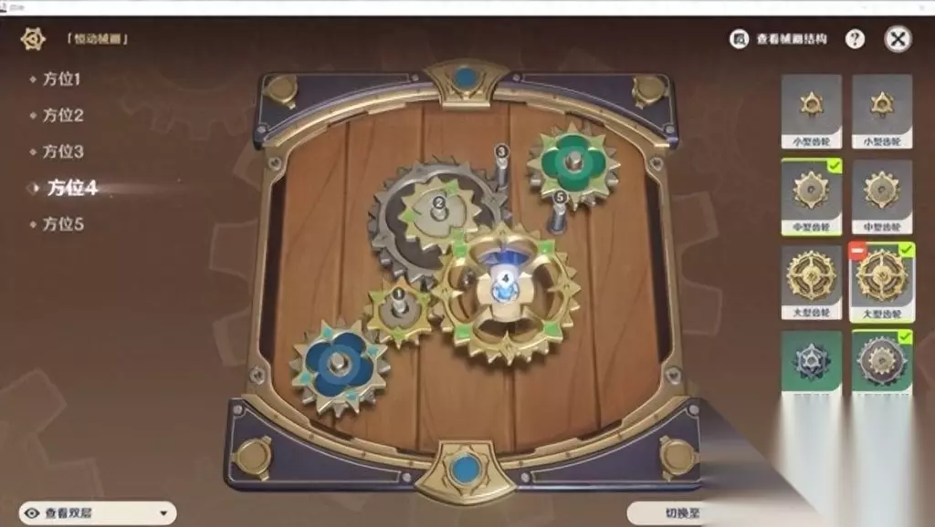 3.三号位可以选择不放。 4.四号位放置一个大型齿轮,不用调整位置,如果你没有按照我的顺序来那么久将大型齿轮调整至上层即可。
