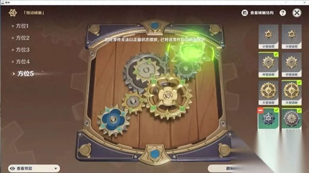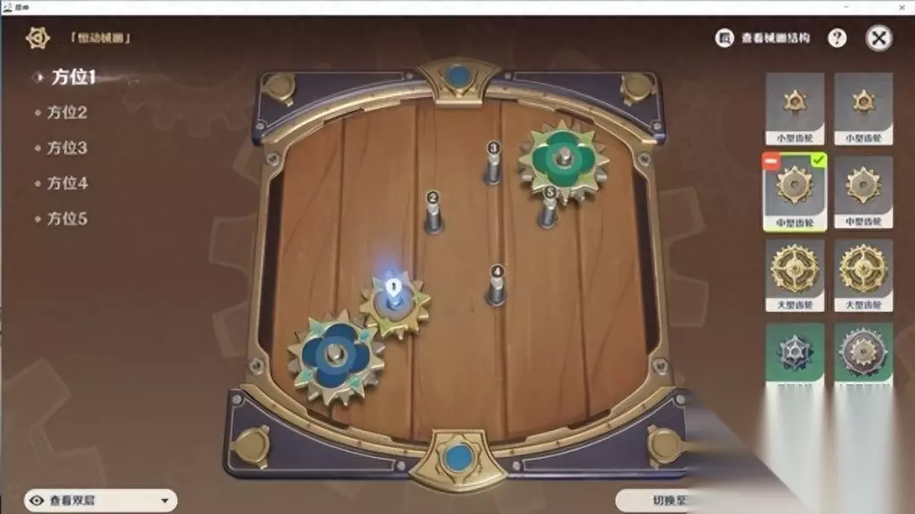 原神恒动械画攻略第五天: 1.一号位放置一个中型齿轮,不用调整位置。
